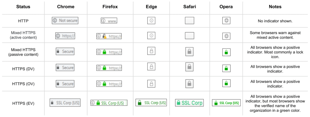 In the early days of the internet, HTTP was the norm and HTTPS was introduced as an option for the very most security minded. As a result, most browsers only used positive indicators, i.e. a lock showing an HTTPS connection, and (optionally) whether that connection uses an EV certificate. Today, to promote security consciousness more broadly, Chrome, along with Firefox and Safari, have also started adopting the use of negative indicators, warning users of pages with unencrypted or mixed active content pages. The following table is a summary for the general state of security indicators in browsers. Starting with HTTP (which is not secure at all) each item further along the list is more secure than the previous ones.
