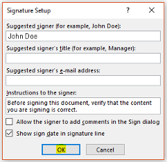 3. A Signature Setup pop-up box will appear. Enter the signer’s information (name, title, and email address) and click OK.
