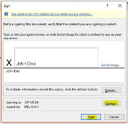 • Select the signing certificate. Click Change if needed to ensure you have the correct certificate.