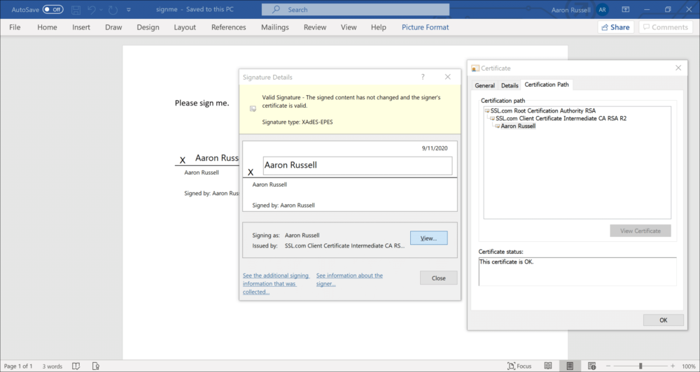 For more information about inspecting digital signatures in Microsoft Office (including invisible signatures), please refer to Viewing Certificate Information in Signed Microsoft Office 365 Documents.