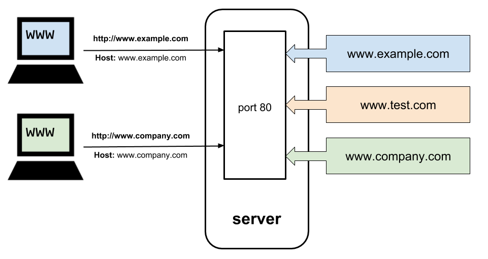 Virtual hosting was also implemented as an early mitigation to the exhaustion problem, with the introduction of the Host header in HTTP 1.1. Browsers communicating over HTTP 1.1 were now able to connect to a server’s port 80 and include the domain name (e.g. www.ssl.com) of the website they wanted to visit in the Host header. Regardless of how many sites a server hosted on the same port, it could use this information to identify the correct website and return its content.