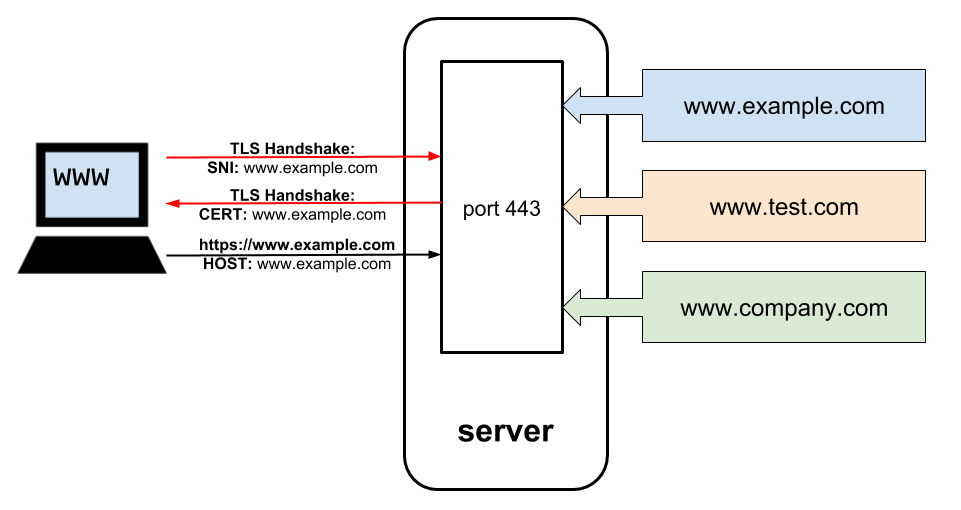 SNI enables browsers to specify the domain name they want to connect to during the TLS handshake (the initial certificate negotiation with the server). As a consequence, websites can use their own SSL certificates while still hosted on a shared IP address and port, because HTTPS servers can use the SNI information to identify the appropriate certificate chain required to establish the connection.