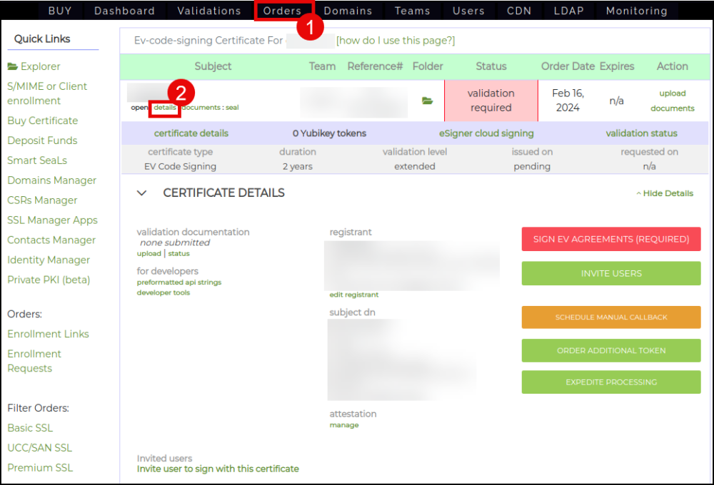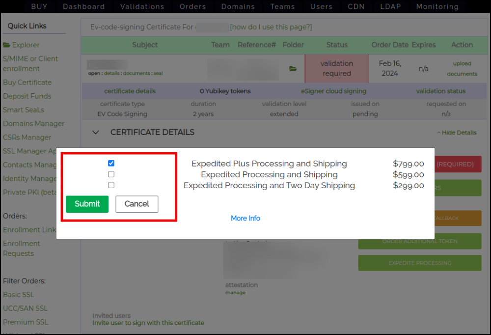1.On the Orders tab of your SSL.com customer account, select the unvalidated order you wish to put up for expedited processing and shipping and click the details link to display the information about the order.