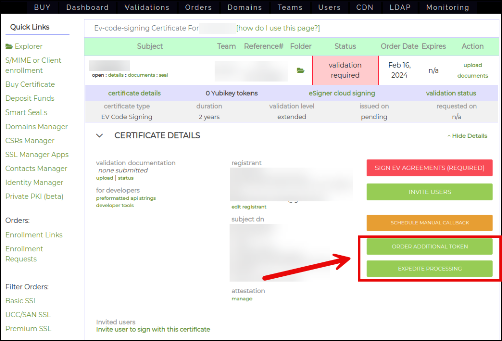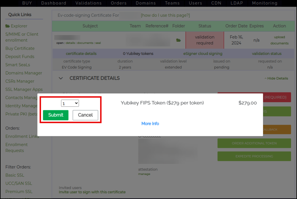 - If you would like to order a Yubikey FIPS Token from SSL.com, click the green button to the right that says ORDER ADDITIONAL TOKEN.