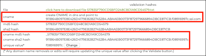 This method requires you to create a CNAME entry in your domain’s DNS record that is pointed at ssl.com (and in some cases comodoca for Comodo chained certificates). An MD5 hash as well as a SHA-256 hash of the CSR are required for this CNAME entry, plus a unique token.