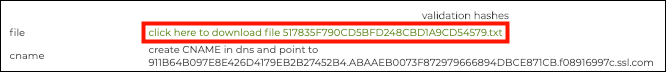 The file is created from taking two hashes of the Certificate Signing Request (CSR) and uploading a text file with that information to a specific location on the server. The file has the MD5 hash for a name with the SHA-256 hash as the first line of the contents of the file. The next line of the file has the term “ssl.com”, while the last line of the file has a unique token.  All actual hash and random values will be presented to you via the user portal.