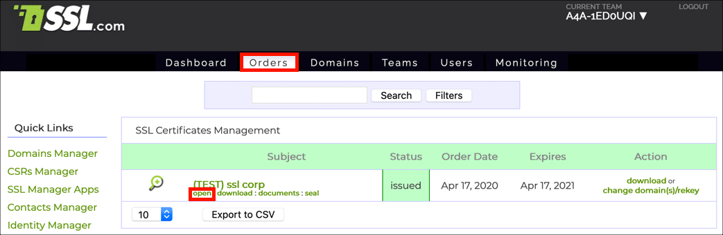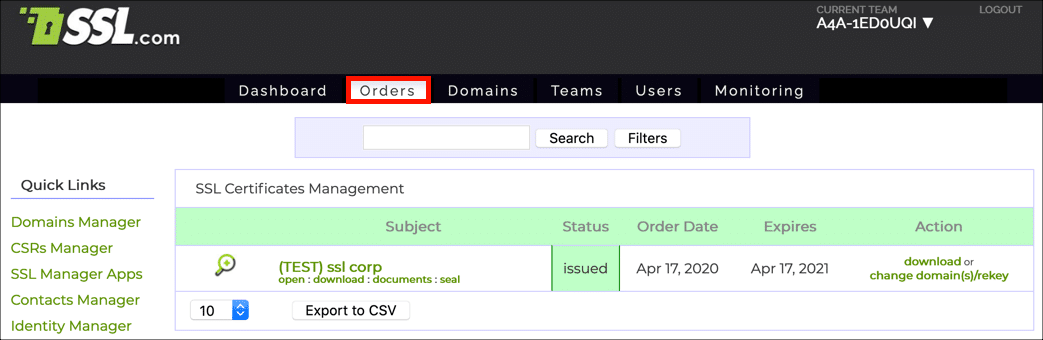 - Login to the SSL.com customer portal and navigate to the Orders tab.