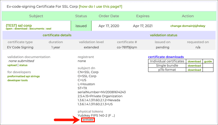 - If the activated token does NOT contain an issued certificate, please contact SSL.com by email at Support@SSL.com or by using the chat link on this page. An SSL.com representative will provide your certificate and your YubiKey’s management key.