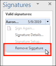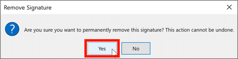 - A dialog box will appear. Click the Yes button to confirm that you want to remove the signature.