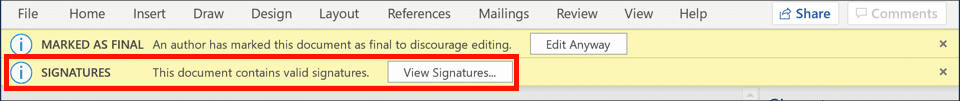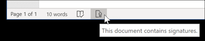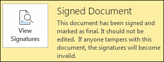 - When the signed document is opened in Word, users will be alerted that the document is signed.