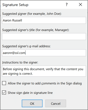 - The Signature Setup dialog box will appear. Here you can specify the suggested signer’s name, title, and/or email address, and add instructions to the signer. The two checkboxes below the text field can be used to allow the signer to add a comments when signing and show the signing date in the signature line. Click OK when you have entered all of the information for the signature line.