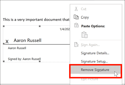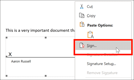 - To sign the document, right-click the signature line and select Sign from the menu.