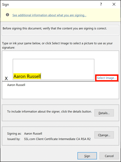 - The Sign dialog box will appear. For a printed signature, simply type your name to the right of the X as shown below, or draw a signature with your pointing device or touchscreen. If you have an image of your handwritten signature, you can use that instead by clicking the Select Image… link and navigating to the image file.