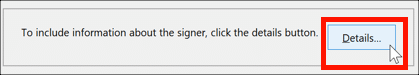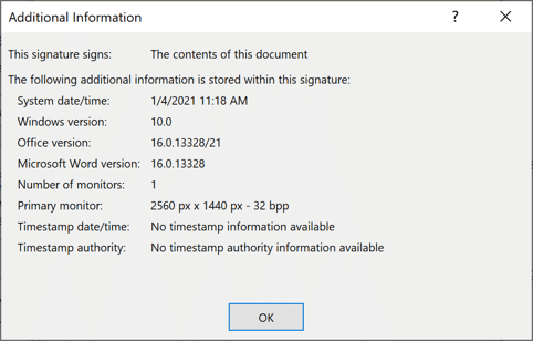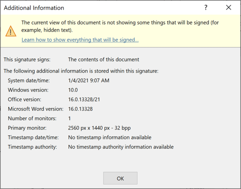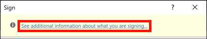 - Clicking See additional information about what you are signing will open a dialog box showing metadata that will be included in the signature.