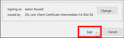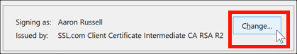 - The certificate which will be used to sign the file is shown near the bottom of the dialog box. Clicking the Change button will open a dialog box for choosing from available certificates. In this case only one document-signing certificate is installed so only one choice is shown.