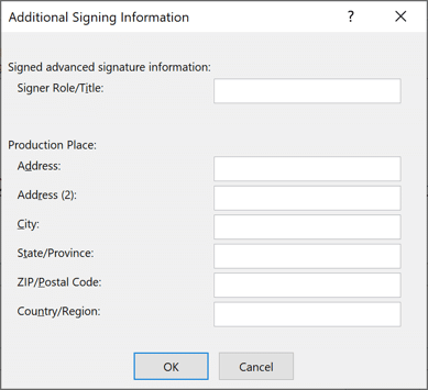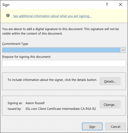 - Clicking the See additional information about what you are signing… link at the top of the dialog box will open a dialog box showing metadata that will be included in the signature.