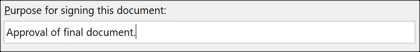 - The Purpose for signing this document text field allows you to explicitly specify the purpose for signing.