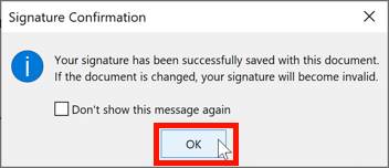 - A dialog box will appear confirming that the document has been signed. Click the OK button to close it.
