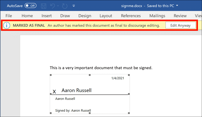 - A message will appear at the top of the screen indicating that the document has been marked as final, and the signature line will be marked as signed at the bottom. If you chose to display the date with the signature it will be shown at the top right of the signature line.