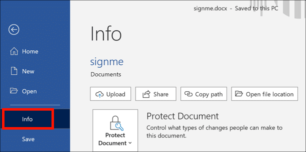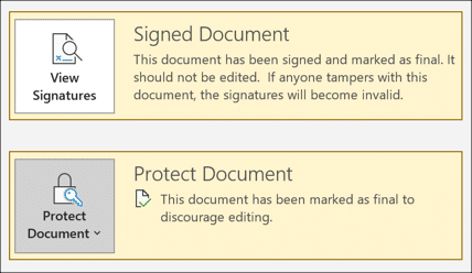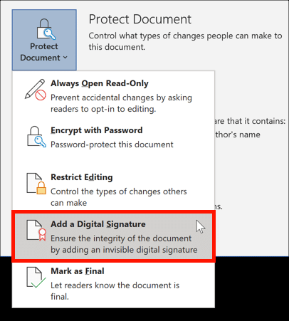 - Click Protect Document (Word), Protect Workbook (Excel), or Protect Presentation (PowerPoint), then select Add a Digital Signature from the menu.