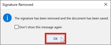 - A dialog box confirming that the signature has been removed will appear. Click OK to close the box.