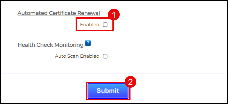 - Scroll to the Automated Certificate Renewal section. Clear the Enabled checkbox. Finally, click the Submit button to apply the changes.