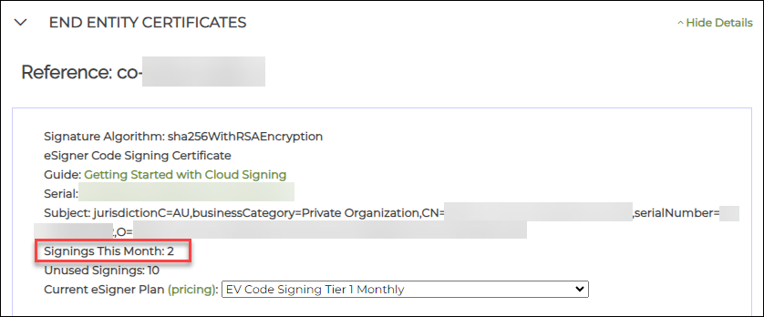 2. Locate the Signings This Month subsection. This shows the total signings you have made for the current month using your eSigner certificate.