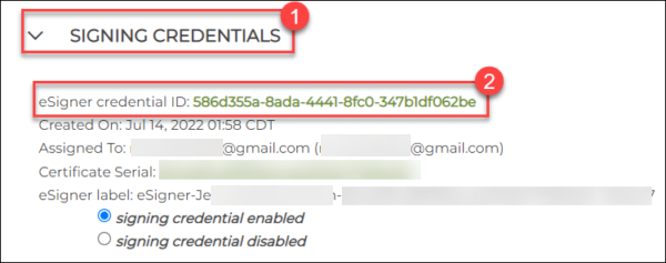 4. Scroll down to the SIGNING CREDENTIALS section, click it, and here you will be able to see your eSigner credential ID.