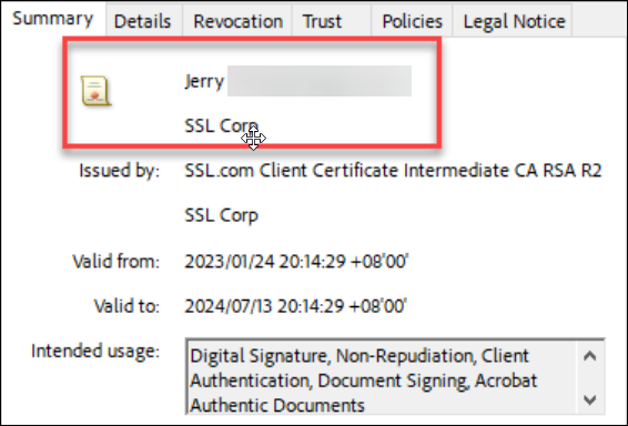 If Individual Validation (IV) is required in the signing process, then an organization needs to order multiple certificates, each one of which can be named to an actual person.  This is particularly useful in document signing where the name of a person has to appear in the certificate and the digital signature. For organizations wanting the names of their CEO, managers, or specific employees to appear in the signing credential and the signed document, ordering multiple certificates is a necessity.  The screenshot below shows an IV+OV document signing certificate that was used to sign a PDF. The certificate details clearly show the name of the signer and the organization he is a part of.