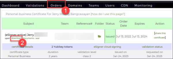 The signing credential can be viewed through your SSL.com account order page by following the instructions below: