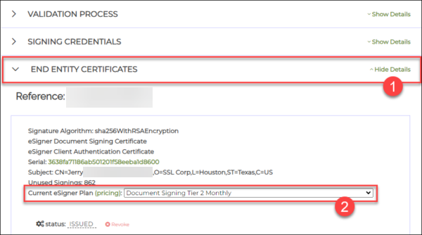 2. Scroll down to the END ENTITY CERTIFICATES section. Click Show Details. Locate the subsection named Current eSigner Plan. Here is where you can upgrade or downgrade your eSigner Tier. Click the drop-down arrow to change your Tier level and the maximum number of signing credentials allowed for your certificate.