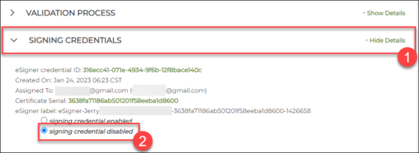 1. The first method is by disabling the signing credential but keeping the certificate intact. This can be done by scrolling down the order page to the SIGNING CREDENTIALS section. Click Show Details to display all the credentials enabled with the certificate. Locate the target credential and click the radio button for signing credential disabled