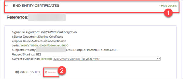 2. The second method is revoking the certificate which, consequently, will disable all signing credentials previously generated using that certificate. This is particularly applicable for certificates that have multiple issuances. You should only do this if you do not have any need of the certificate. Take note that there will be a fee to reactivate a certificate once it is revoked. Begin by scrolling down the order page to the END ENTITY CERTIFICATES section. Click Show Details. If there are multiple certificate issuances, locate the one you wish to revoke and click the Revoke link marked by an X.