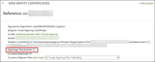 A signing done using one eSigner Credential ID is counted as one signing. To view the total signature usage for an eSigner-enrolled signing certificate, please refer to the instructions below: