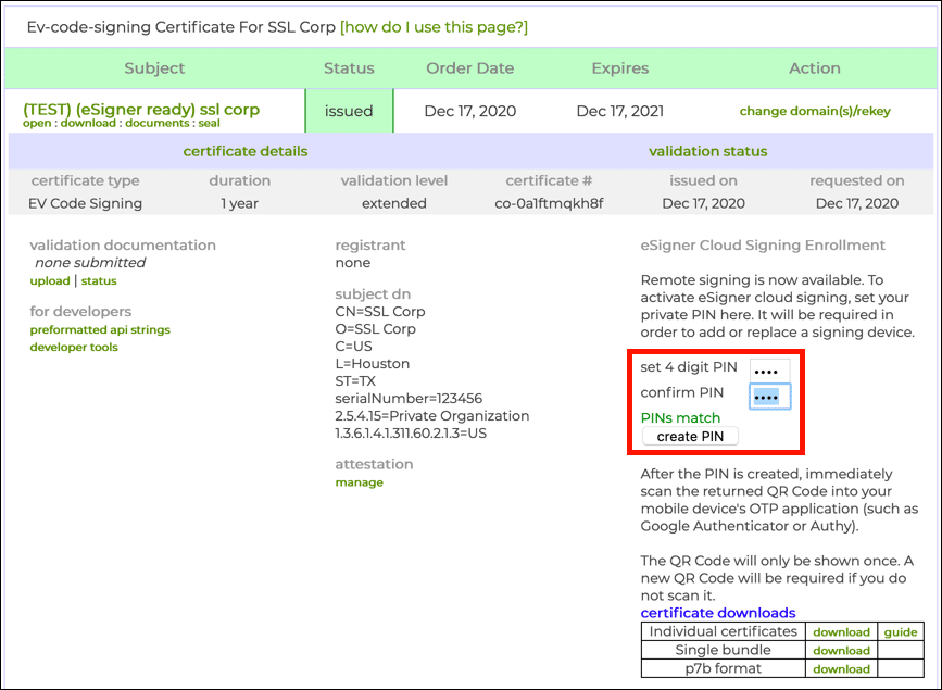 • Your certificate will be generated, and after a few moments a QR code will appear above the certificate downloads table.