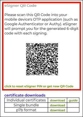 • The next time you reload the page the QR code will not be visible. If you need to to view or reset your eSigner QR code, please read this how-to.