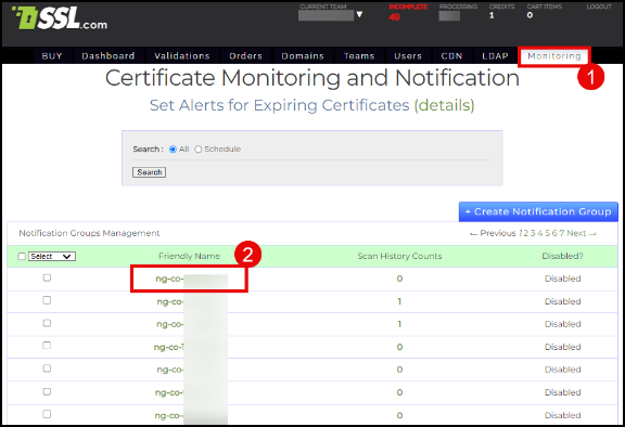 SSL certificates are inherently time-limited, necessitating vigilant management to avoid lapses in coverage. Recognizing this, SSL.com proactively dispatches email alerts as your certificate nears its expiry date, enhancing your security posture by preventing unintended service interruptions or vulnerabilities. You have the flexibility to customize up to five reminders, which are triggered and sent out based on the number of days before the certificate expires you’ve specified. For example, if you choose a 30-day reminder, you’ll receive an email notification exactly 30 days before your SSL certificate is set to expire. Initially, these reminder emails are directed to both the administrative and technical contacts designated during the certificate purchase. You’re given the option to update these email addresses or adjust which contacts receive the notifications. You can modify these notification settings directly within your SSL.com account, providing you with a comprehensive control over how and when you receive these critical reminders. The following are instructions on how you can modify the expiration notification settings for your certificate:- On your SSL.com account, click Monitoring on the top menu to display your list of certificates that can be configured for expiration reminders. On the Friendly Name column, click the link indicating ng (notification group) followed by the reference number of your certificate (e.g. co-ab123456c).