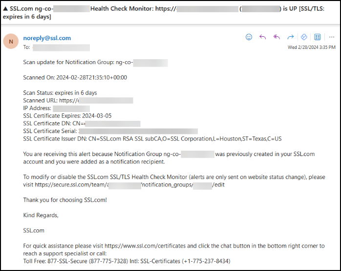 SSL.com’s Health Check Monitoring (HCM) service complements the SSL certificate expiration reminders by providing a more comprehensive and proactive approach to managing SSL/TLS certificates and overall website security. By subscribing to SSL.com’s Health Check Monitoring (HCM) service, customers gain several significant additional security benefits beyond just receiving free expiration reminders for their SSL/TLS certificates. Our SSL/TLS Health Check Monitoring (HCM) service is designed to provide real-time, detailed insights into your website’s SSL/TLS certificate configuration. This service meticulously analyzes your domain’s certificate to evaluate its security effectiveness and the precision of its installation. It identifies the compatibility with various ciphers and algorithms, as well as compliance with trusted repositories including Google Chrome, Microsoft Edge, Mozilla Firefox, Apple Safari, and Java. In addition, the HCM service keeps account managers proactively informed about the expiration dates of certificates, allowing for timely renewals. Moreover, in scenarios where critical alterations occur, such as site unavailability due to an expired or revoked certificate, account managers are immediately alerted. Customers can also utilize our intuitive interface to effortlessly schedule regular website scans. These scans can be customized to occur at specific time intervals, even down to the minute, or can be set for particular days or dates. This flexibility ensures continuous monitoring and maintenance of your website’s SSL/TLS health. In summary, while SSL.com’s expiration reminders are a useful tool for maintaining the validity of SSL/TLS certificates, the Health Check Monitoring service provides a deeper level of security management. It ensures that certificates are not only up-to-date but also properly installed and configured for maximum security and compliance, offering a holistic approach to digital certificate management and website security.The image below shows an example of a Health Check Monitoring email that SSL.com sends to customers.