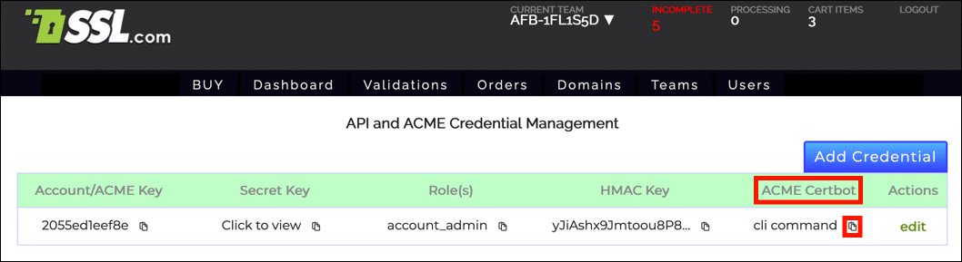 4. You can also copy a Certbot command pre-filled with your email address, Account/ACME key and HMAC key by clicking the clipboard icon () next to cli command, below ACME Certbot. This pre-formatted command will order a certificate via the HTTP-01 challenge method.Copy certbot command