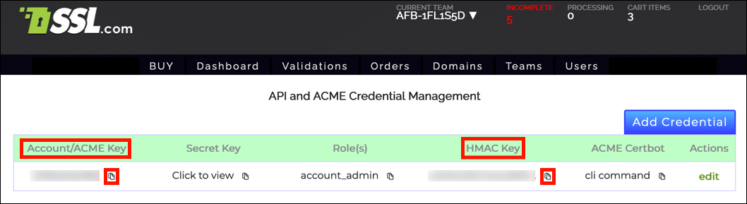Before using ACME to request a certificate, you will need to retrieve your Account Key and HMAC Key from your SSL.com account.