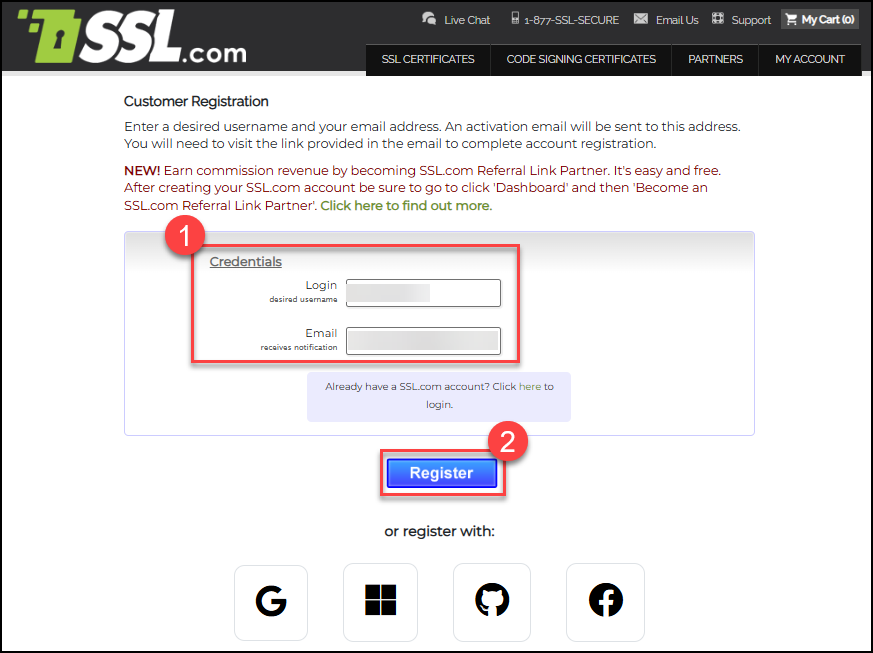 SSL.com is currently offering a Single Sign On method to create an SSL.com online customer account by linking a Google, Microsoft, or GitHub account.