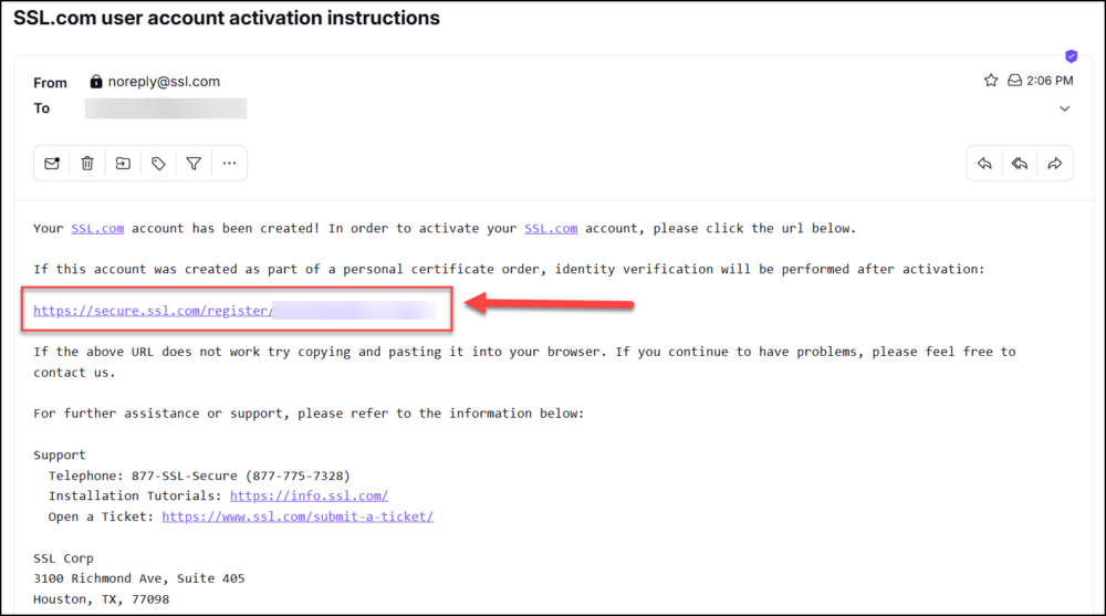 - Now that your account is created, the next step is to activate it. You will not be able to login and use your account if activation has not been performed. Check your email address for instructions sent by SSL.com to activate your account and click the activation link.