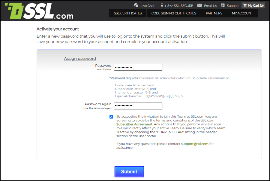 - Upon clicking the activation link, you will be asked to generate a secure password for your account. Take note of the requirements for a valid password. Afterward, check the box confirming that you agree to abide by SSL.com ‘s Subscriber Agreement. Finally, click the Submit button.