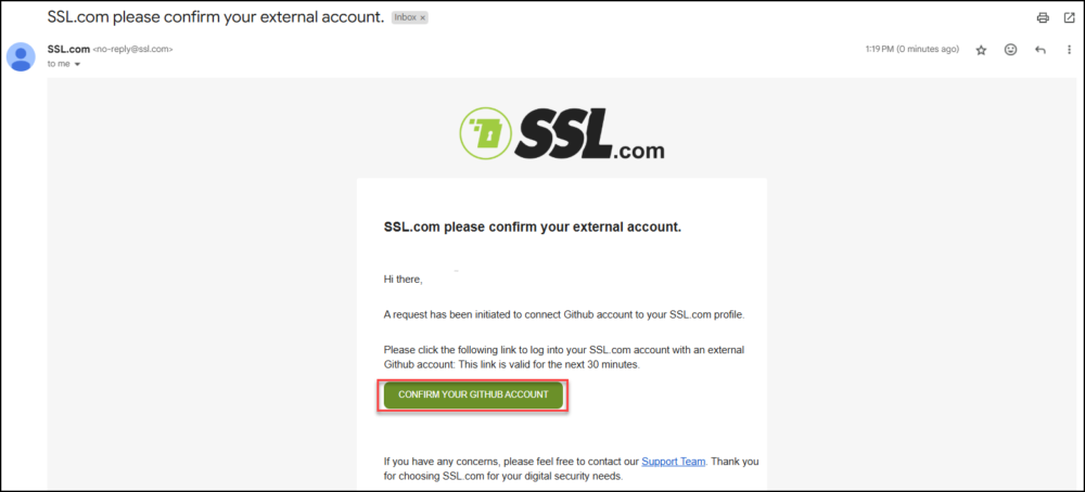 - On another tab, open your Github account’s registered email and check the email from SSL.com, requiring you to confirm your Github account. Click the confirmation link.