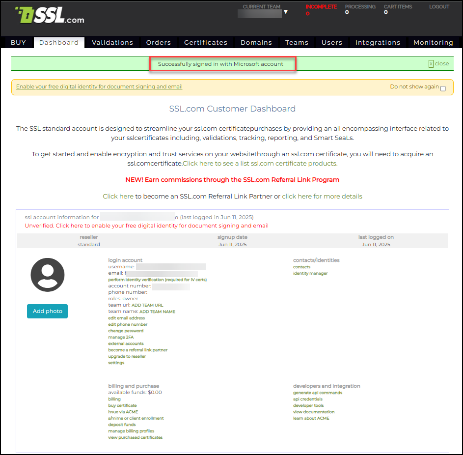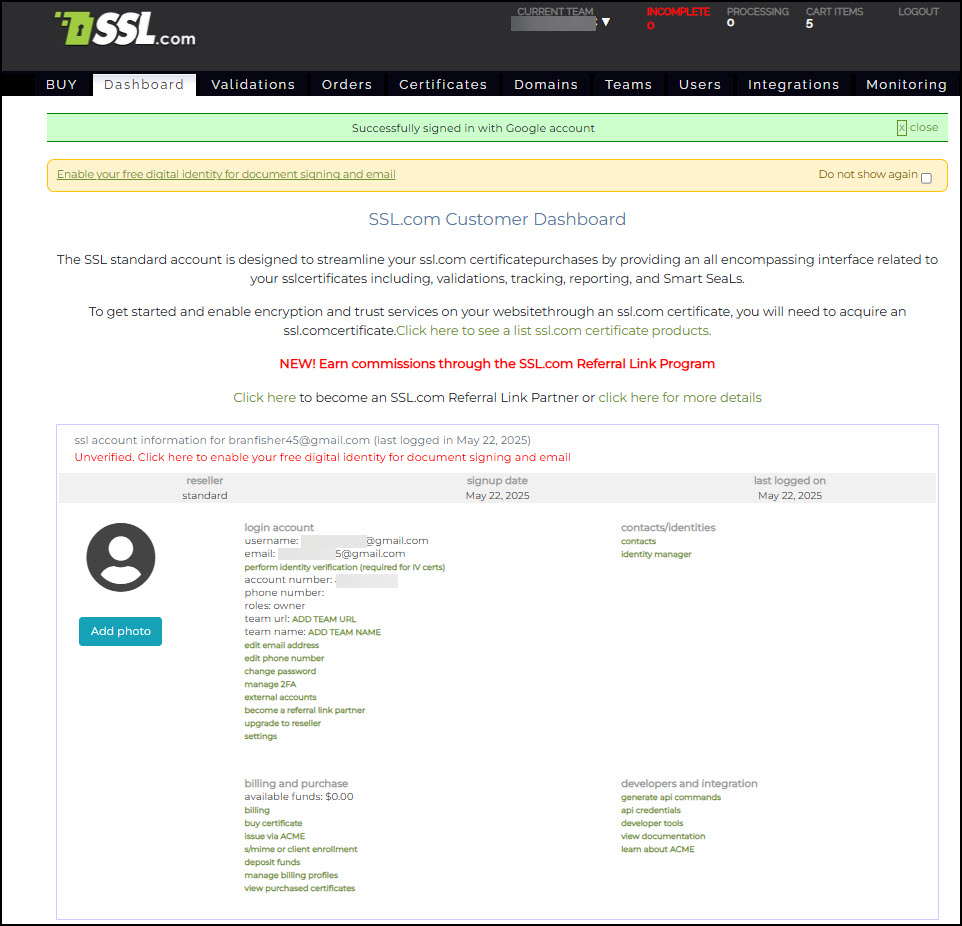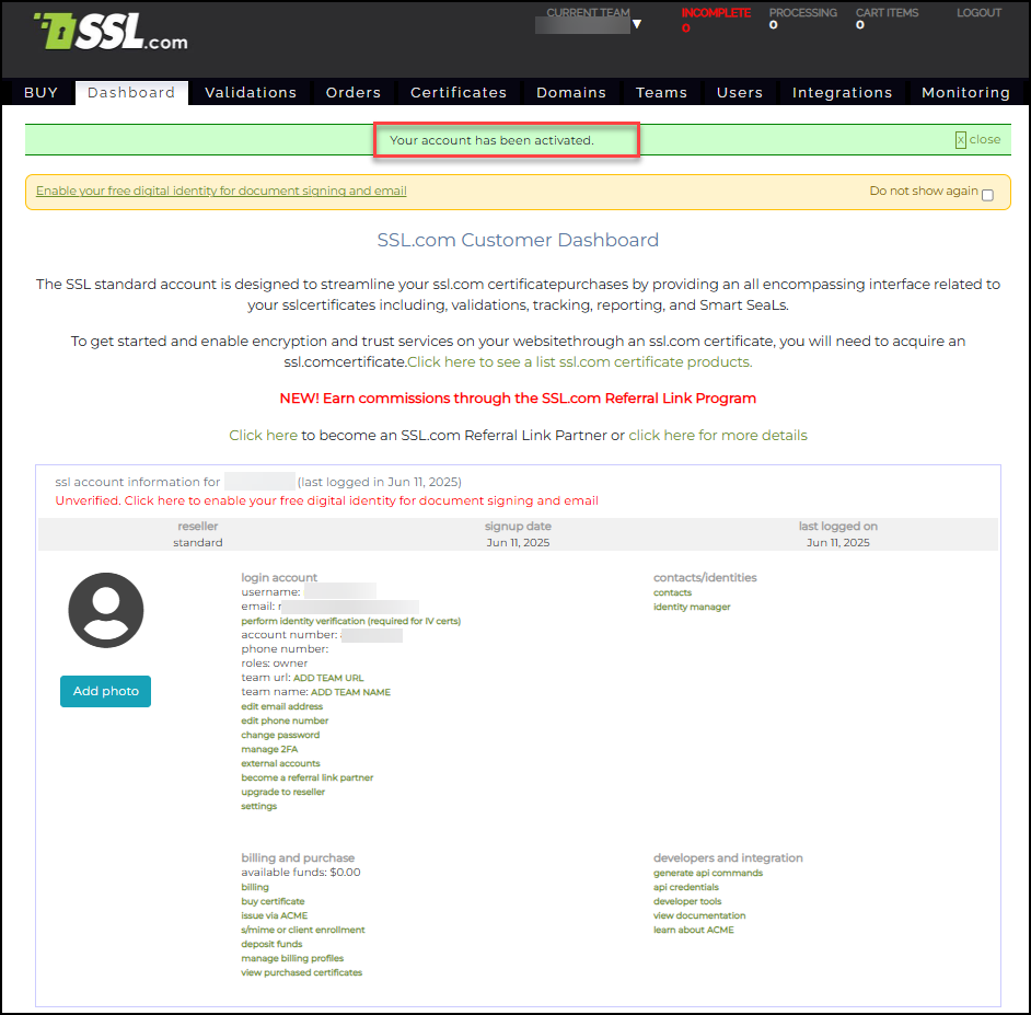 - On your dashboard, you will see a message indicating a successful creation of your SSL.com account.