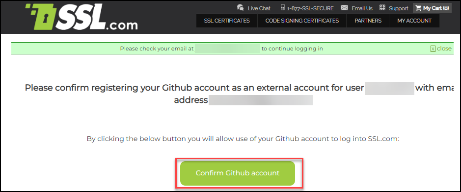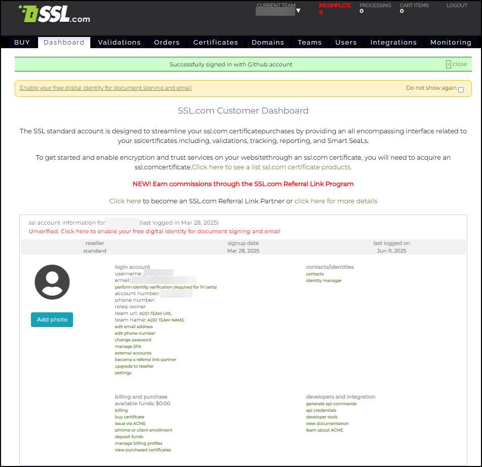 - You have successfully created your SSL.com account by linking your GitHub account credentials!