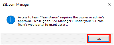 4. A dialog box will appear indicating that access to the team’s information requires approval. Click the OK button to dismiss the alert.