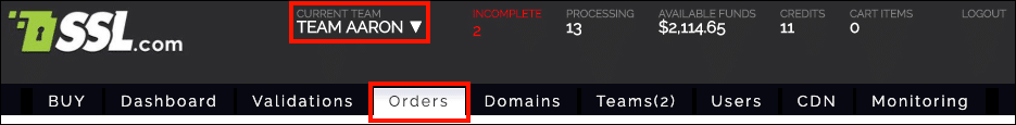 5. Log into your SSL.com account portal and go to the Orders tab. Make sure that the team you want to use is set as the Current Team.