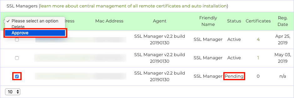 7. Select the instance of SSL Manager that needs to be approved (it will have “Pending” in the Status column), then select Approve from the drop-down menu at the top left.