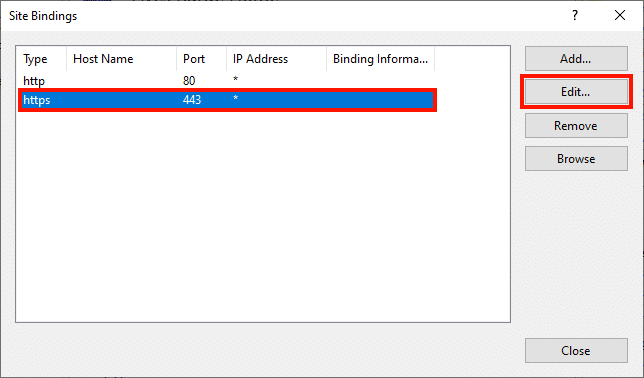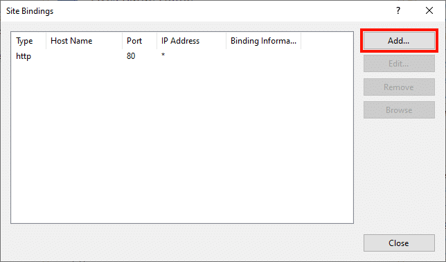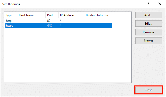 Verify that the binding has been added, then close the Site Bindings window by clicking the Close button.